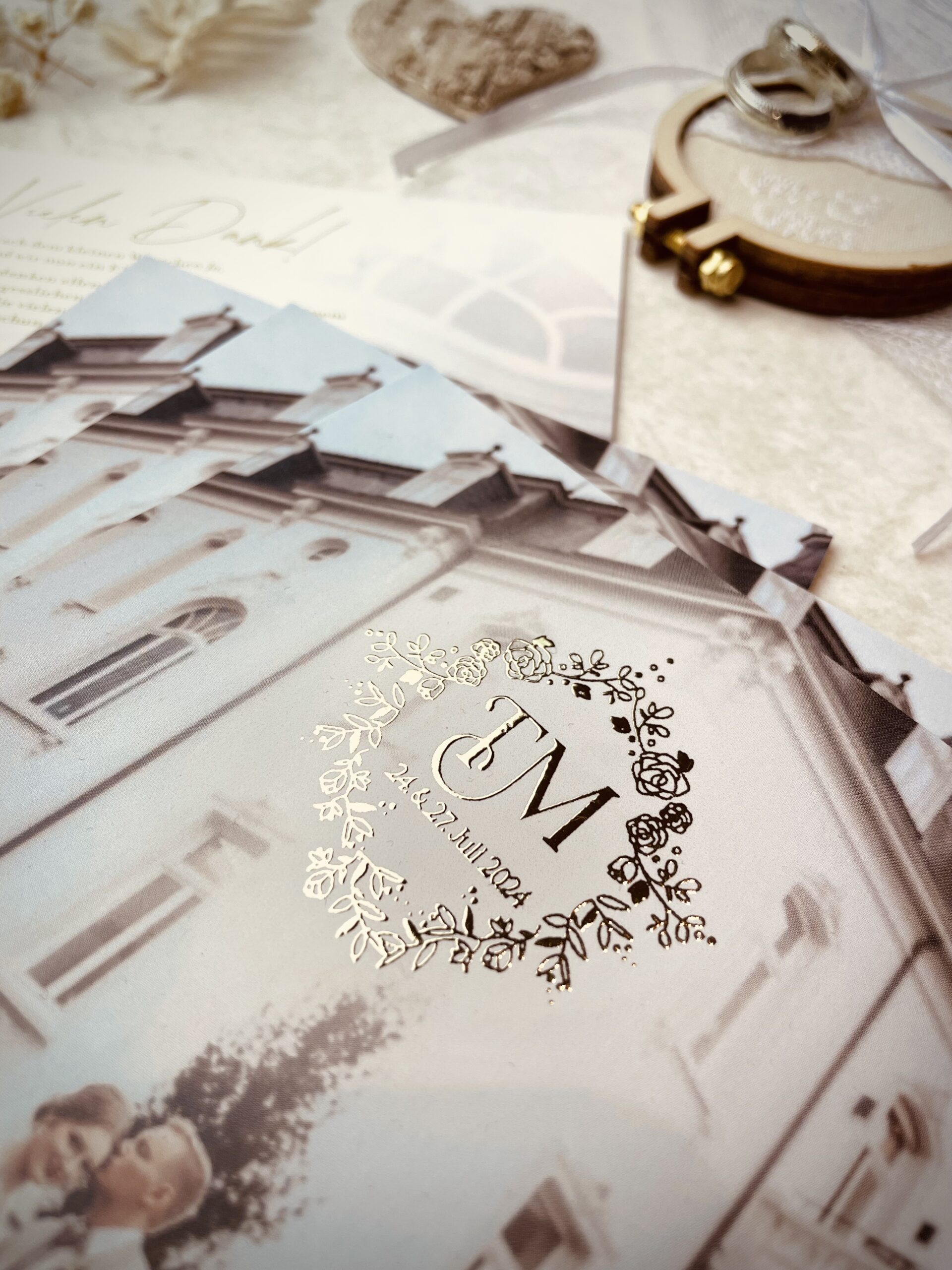 Die Heißfolienprägung in Gold sorgt für schimmernde Highlights und eine fühlbare Struktur auf hochwertigem Papier. Ob Namen des Brautpaares, Hochzeitsdatum, zarte Ornamente oder ein persönlicher Schriftzug – goldene Akzente setzen besondere Details perfekt in Szene. Dank modernster Drucktechnik entsteht ein eleganter 3D-Effekt, der Ihre Dankeskarten einzigartig macht.